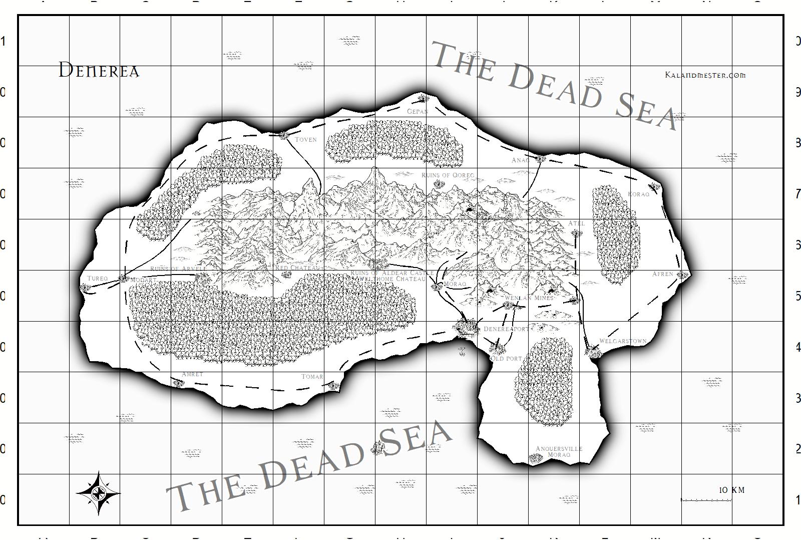 A városok egy részét a folyókhoz jó tenni, ha pedig a folyó torkolata eleve egy öbölnél van, akkor ott lehet egy nagyobb település is. Kalandhelyszínnek pár rom. A cél az, hogy gondoljuk végig, hol és miből élnek. Úgy gondolom hogy a sziget egyik fontos erőforrása a tenger. Akár a tengeri kereskedelem, akár a halászat. Így lesz jópár halászfalu, és lehet a hegy lábánál pár bányász település, ahonnan tutajon vagy hajón is levihető sok árucikk. A sziget ritkán lakott jelenleg, van pár romos, elhagyott település is.